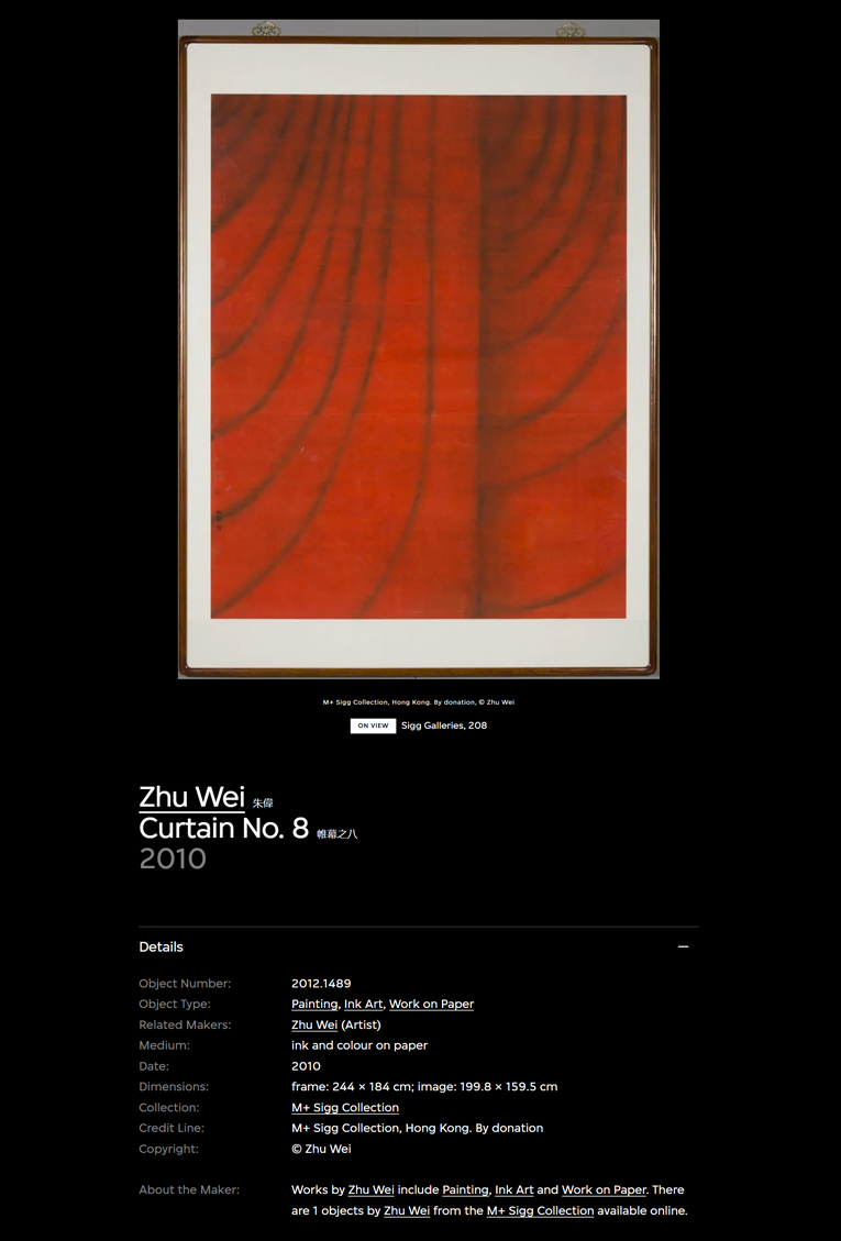 Starting from September 22, 2023, "M+ Sigg Collection: Another Story" is on display at the M+ Museum in Hong Kong. The Exhibition takes a visual approach to examine the styles and practices of contemporary Chinese art from the 1990s to the present, surveys how artists reconsider their cultural identities and express their uncertain state of being during China's rapid modernisation in the 1990s, and brings together a multitude of works that exhibit qualities of overflowing visuals, ambiguous meanings, obsessions with transiency, and traditional interpretation. It offers a different perspective on understanding contemporary Chinese art and foregrounds its unique visual language through the lens of artists who strive for self-presence. Zhu Wei, Curtain No.8, M+ Sigg collection, by donation. 于2023年9月22日开幕的“M+希克藏品:别传”正在香港M+ 博物馆展出。展览以视觉方式探讨1990年代至今中国当代艺术的风格和实践,关注在中国90年代急速转型的社会和经济发展中,艺术家对文化身份的思考及对新时代的困惑。当中聚焦躁动的视觉图像、不确定的意义、对无常的迷恋以及对传统的另类诠释,通过另类视角展现中国当代艺术独特的审美和表达方式。图为展出中的朱伟水墨作品《帷幕之八》。
