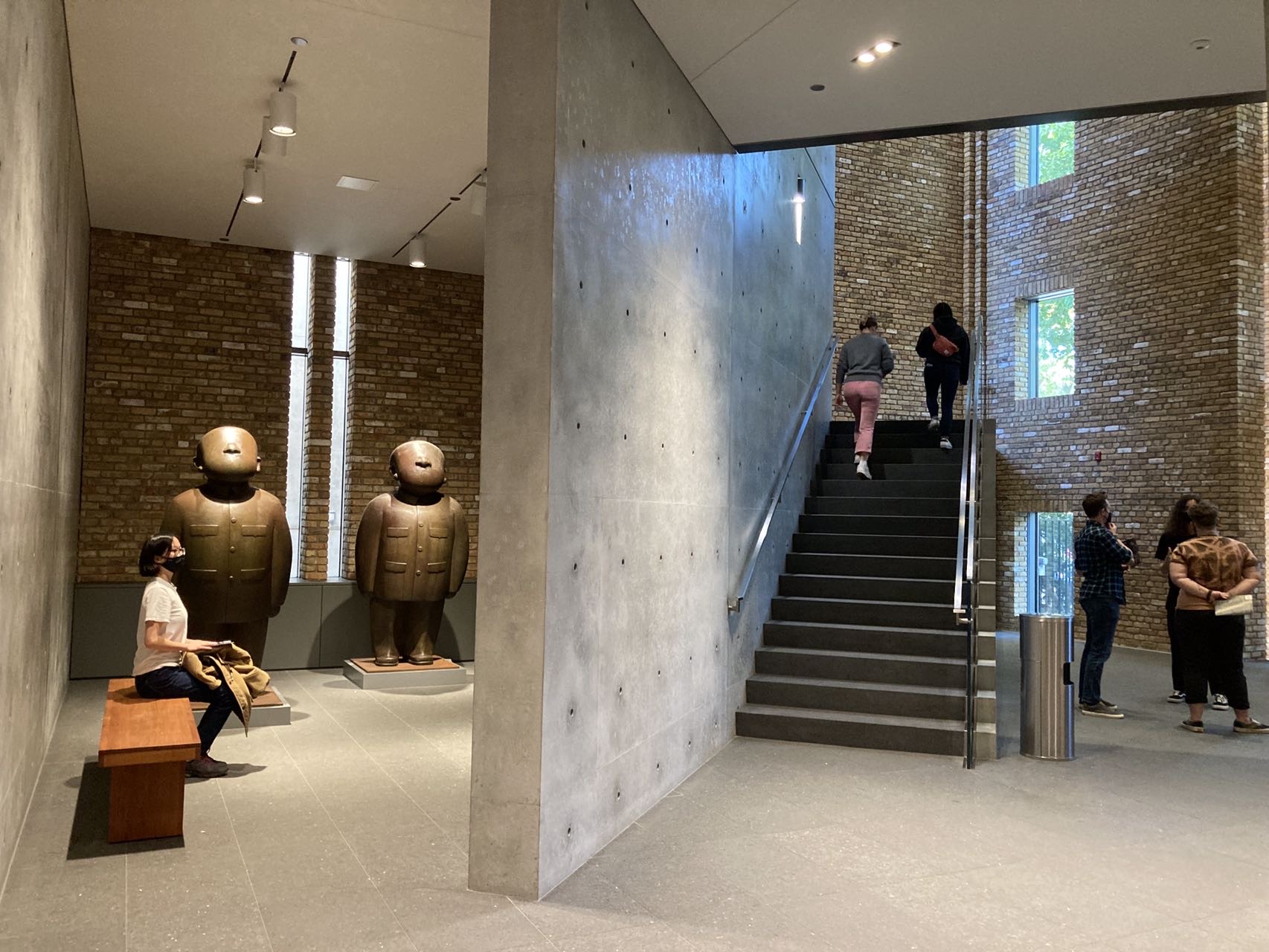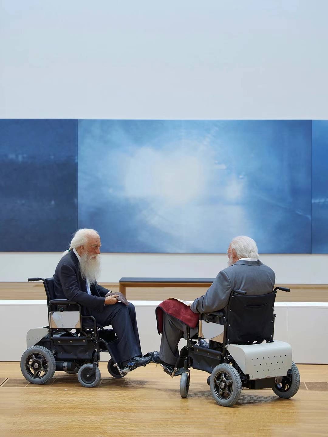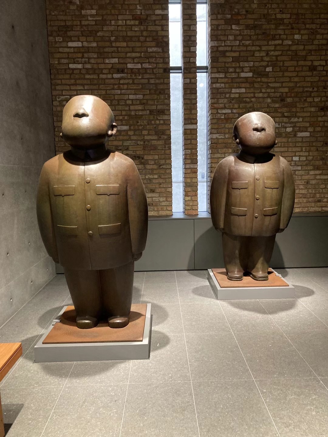 The piece’s two characters are in tunic suits, usually associated with Chairman Mao’s Communist China. (Zhu, who also specializes in printmaking and painting, entered the military as a teenager and created propaganda art until 1992.) 雕塑中是两个穿中山装的人,这通常让人联想到毛主席的社会主义中国。(朱伟还擅长版画和绘画,十几岁参军创作宣传艺术,直到1992年。)