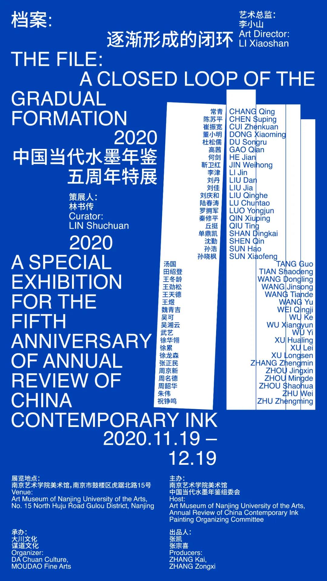 On November 19, 2020, “File: A Closed Loop of the Gradual Formation – 2020 A Special Exhibition for the Fifth Anniversary of Annual Review of China Contemporary Ink” was opened at the Art Museum of Nanjing University of the Arts (AMNUA). The exhibition is directed by Li Xiaoshan, the director of AMNUA, and curated by Lin Shuchuan, the director of academic department of AMNUA. There are more than 80 works by 39 contemporary ink artists showed in the exhibition. 2020年11月19日,“档案:逐渐形成的闭环——2020中国当代水墨年鉴五周年特展”,在南京艺术学院美术馆拉开序幕,此次展览由南京艺术学院美术馆馆长李小山担任艺术总监,南京艺术学院美术馆学术部主任林书传担任策展人,共邀39位当代水墨艺术家参展,展出作品80余件。