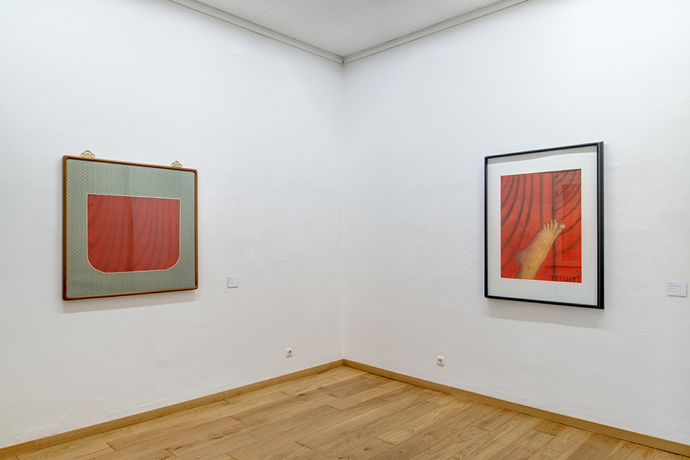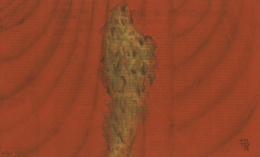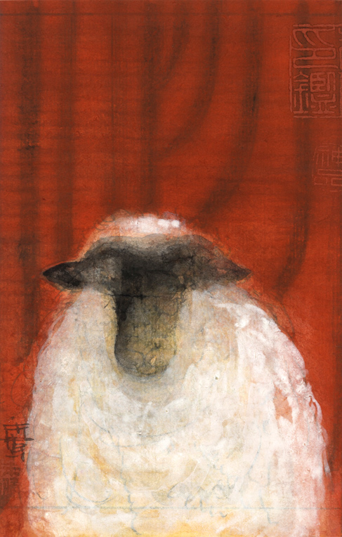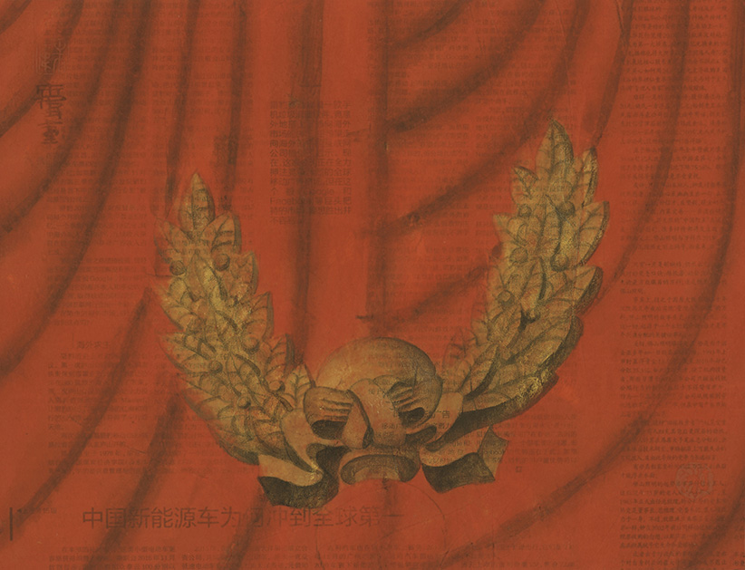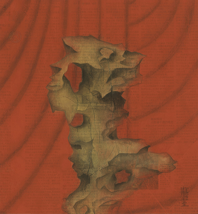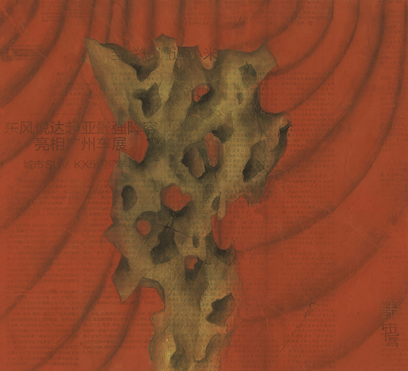 "In these works he no longer paints on Xuan paper or silk, but newspapers which people are quite familiar with. Since what he paints are red curtain and other related symbols, his works are hence more profound in the concept and in the expression."--Lu Hong. “在这些作品中,他不再用熟宣纸与绢作画,而是采用了人们司空见惯的报纸。由于画的是红色帷幕与相关符号,故其作品在观念的表达上更显深刻。”——鲁虹